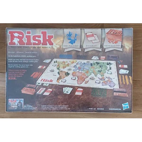 Contains: 1x gameboard 5 "armies" with 40 Infantry, 12 Cavalry, 8 Artillery pieces Deck of 56 Risk cards 1x card box 5 dice 5 cardboard war crates Game Guide Box