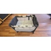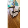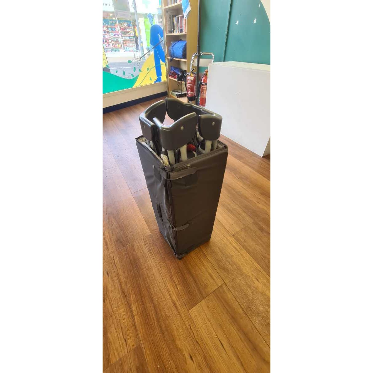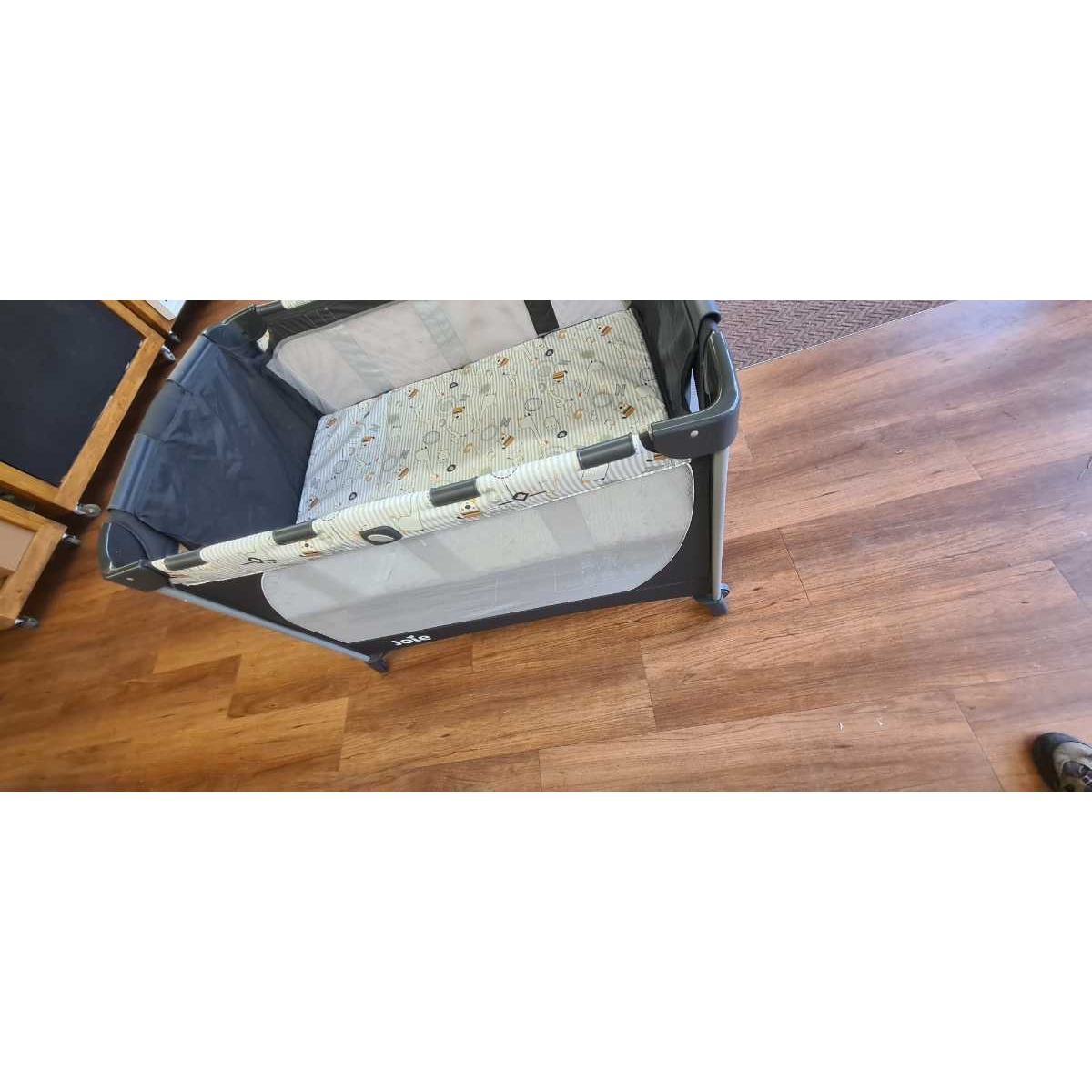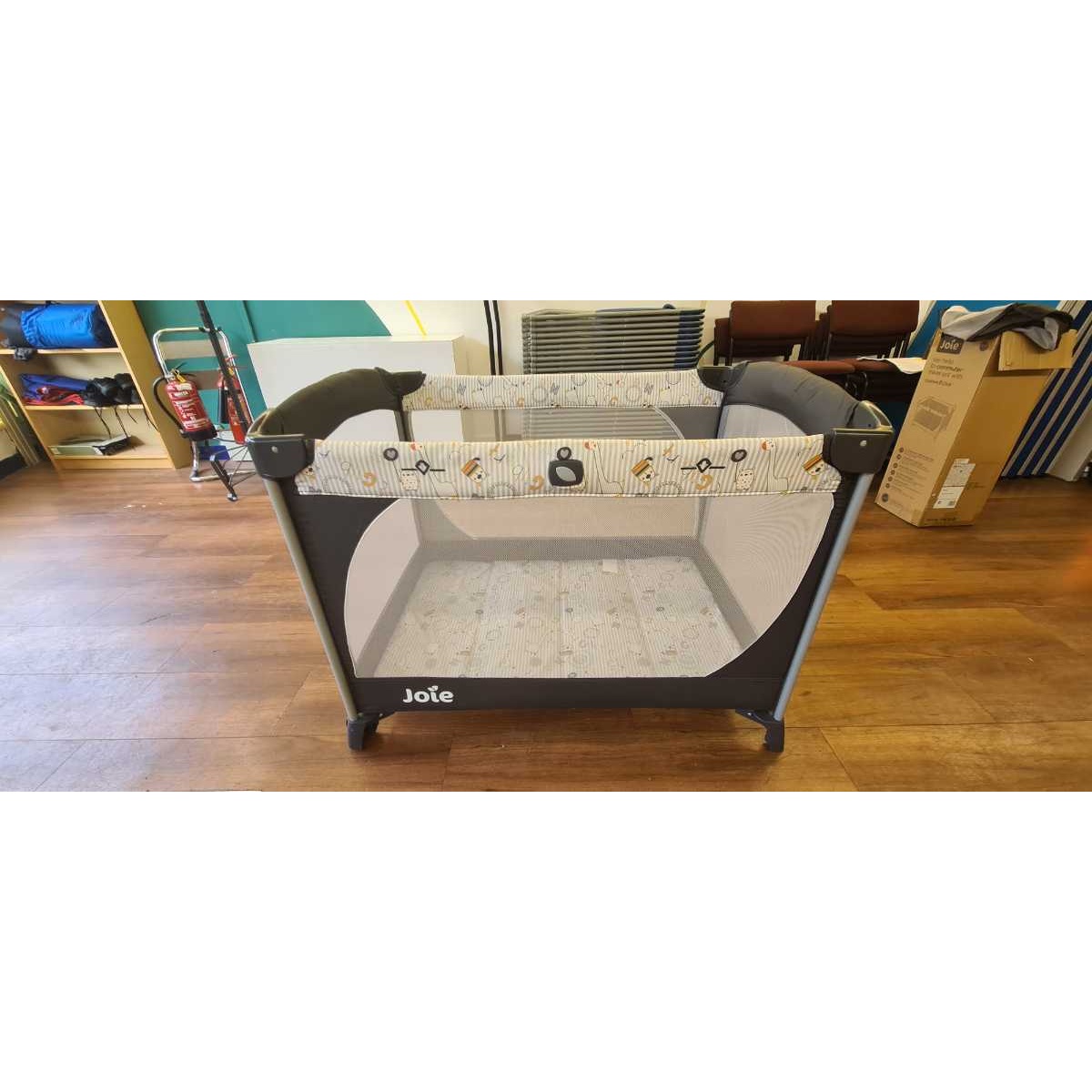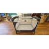 Travel cot suitable from birth to 15kg. Mesh sides. Clip-on basinet for easy access.