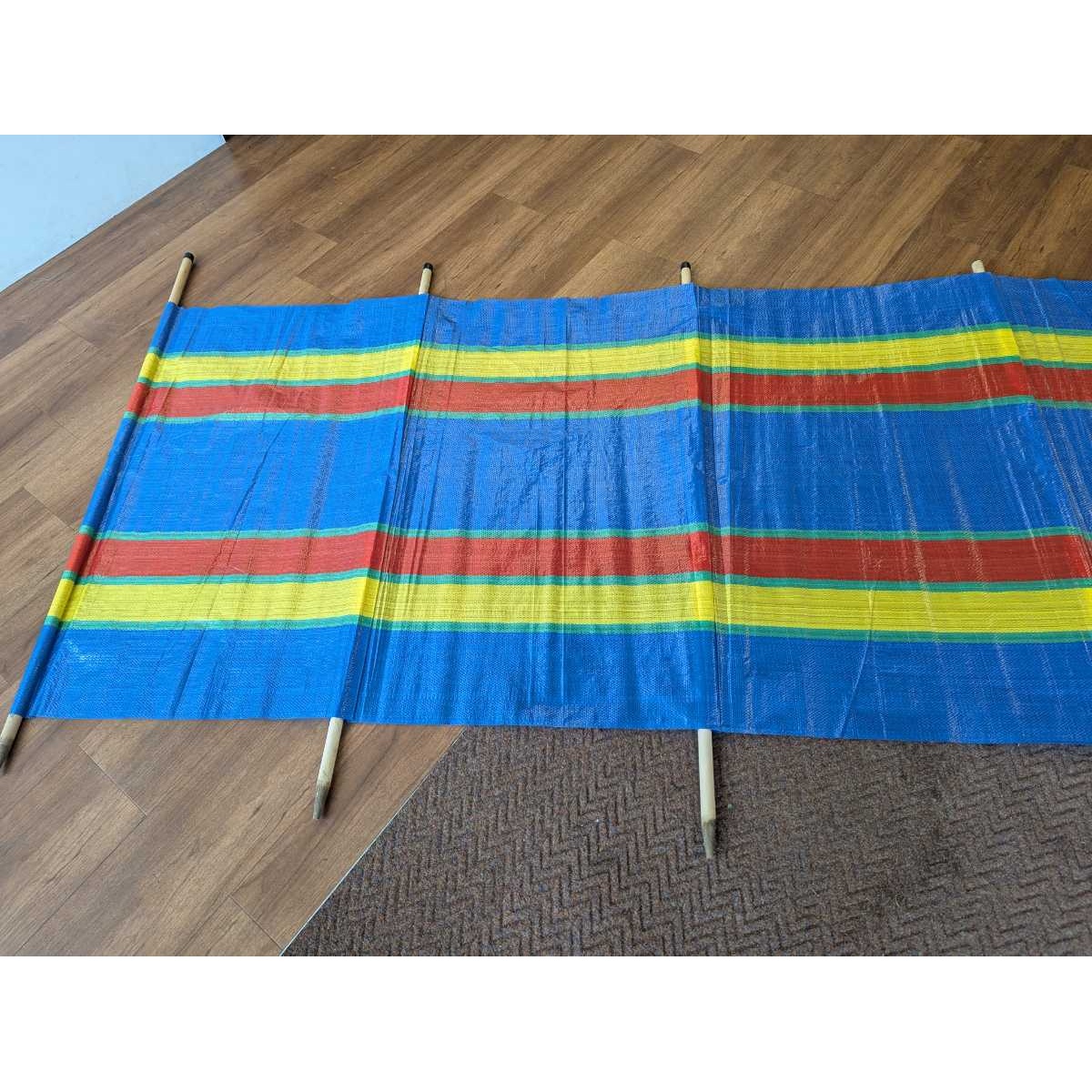 Large windbreak with wooden poles to stake into the ground.