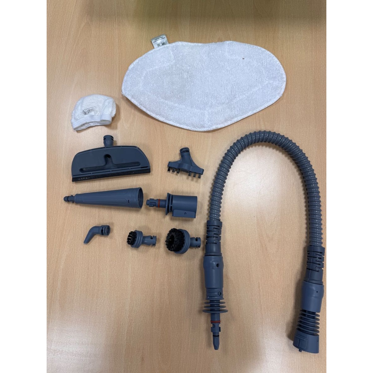 Includes the following attachments: Hose, Adapter, Brush with window cleaner, round brush large and small, Steam concentrator, Accessory for grouting, Floor cloth, Socket for small brush, Steam lance